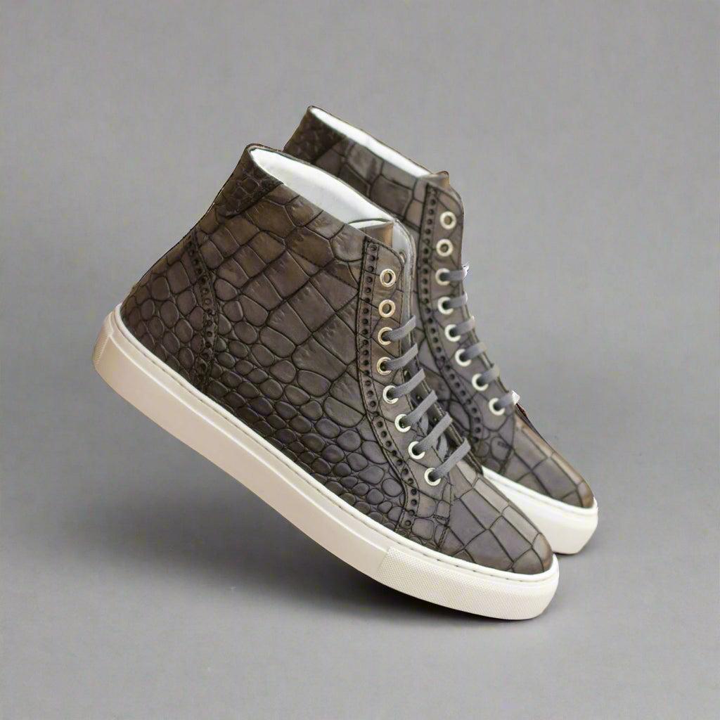 Ambrogio Handmade Men's Shoes Gray Crocodile Print Leather Casual High-Top Sneakers (AMB2234)