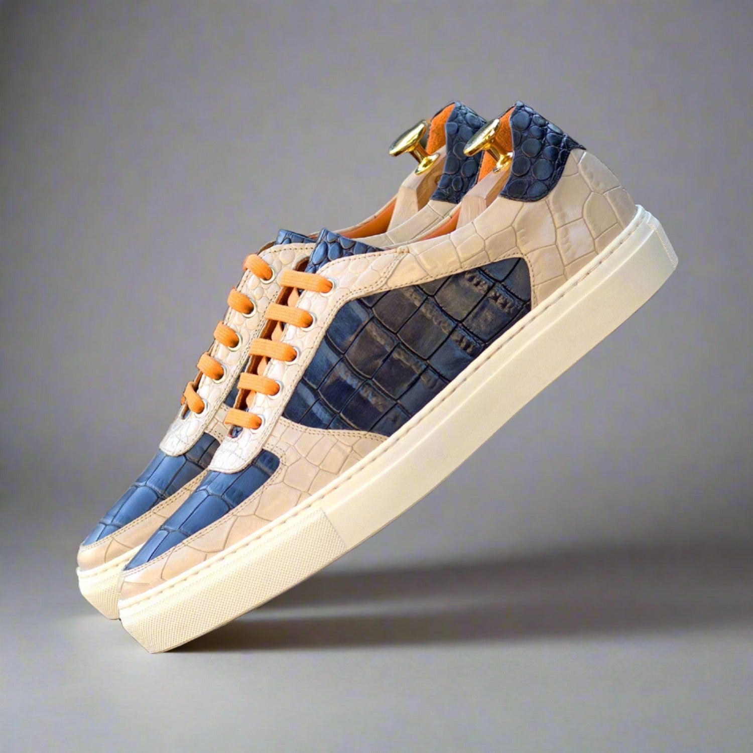 - Ambrogio Handmade Men's Shoes Navy & Nude Crocodile Print Leather Trainer Sneakers (AMB2543)