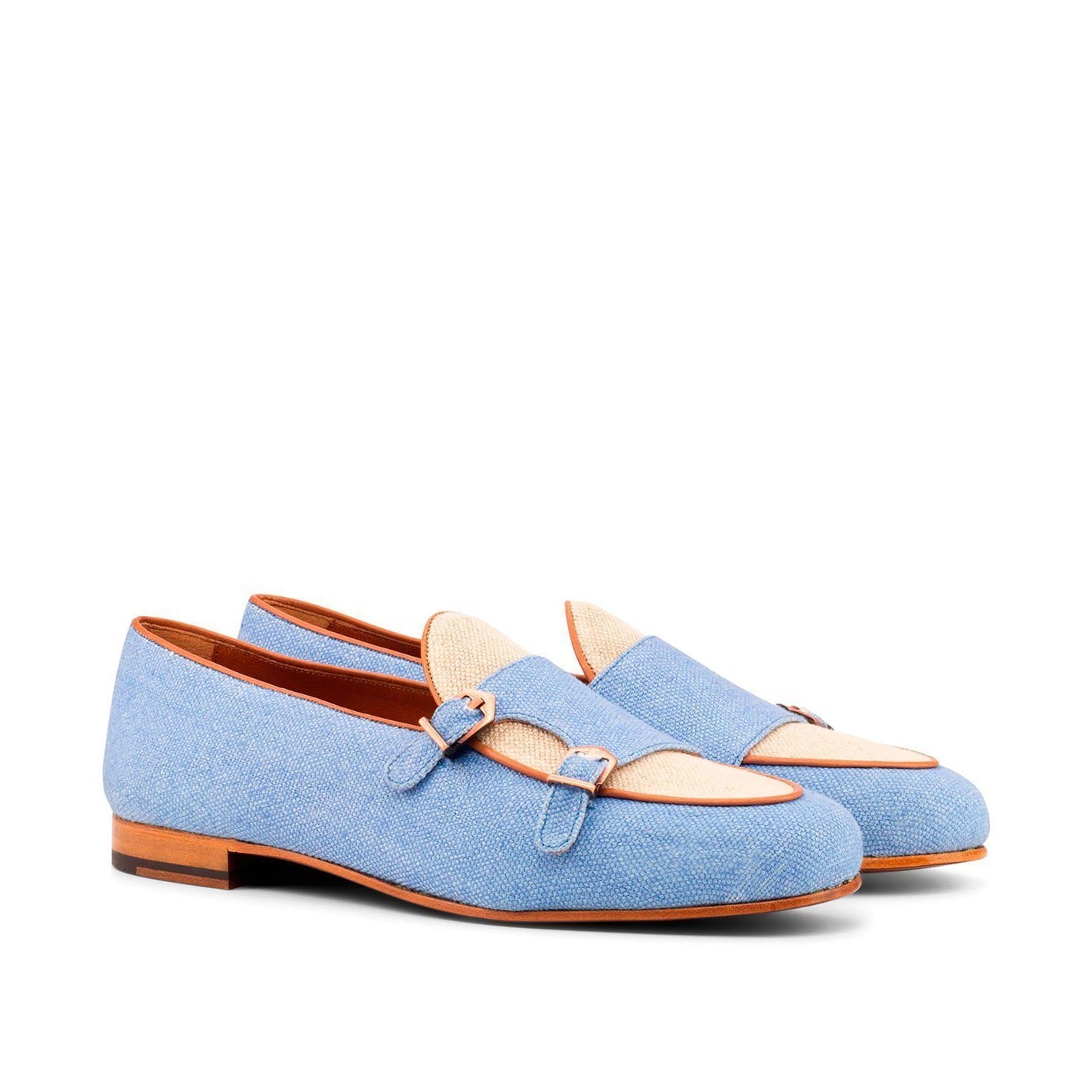 - Ambrogio 3892 Bespoke Men's Shoes Blue & Beige Linen Fabric Monk-Straps Loafers (AMB1274)