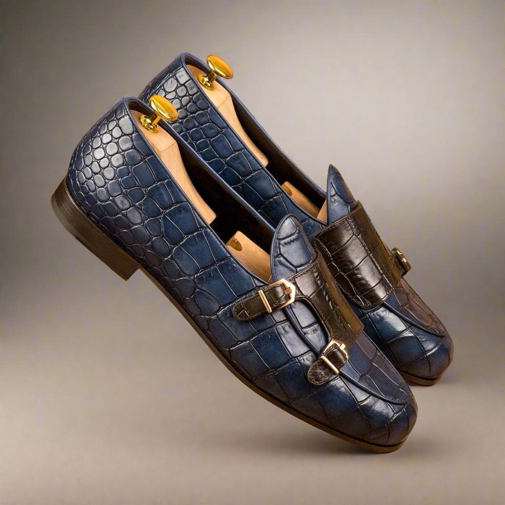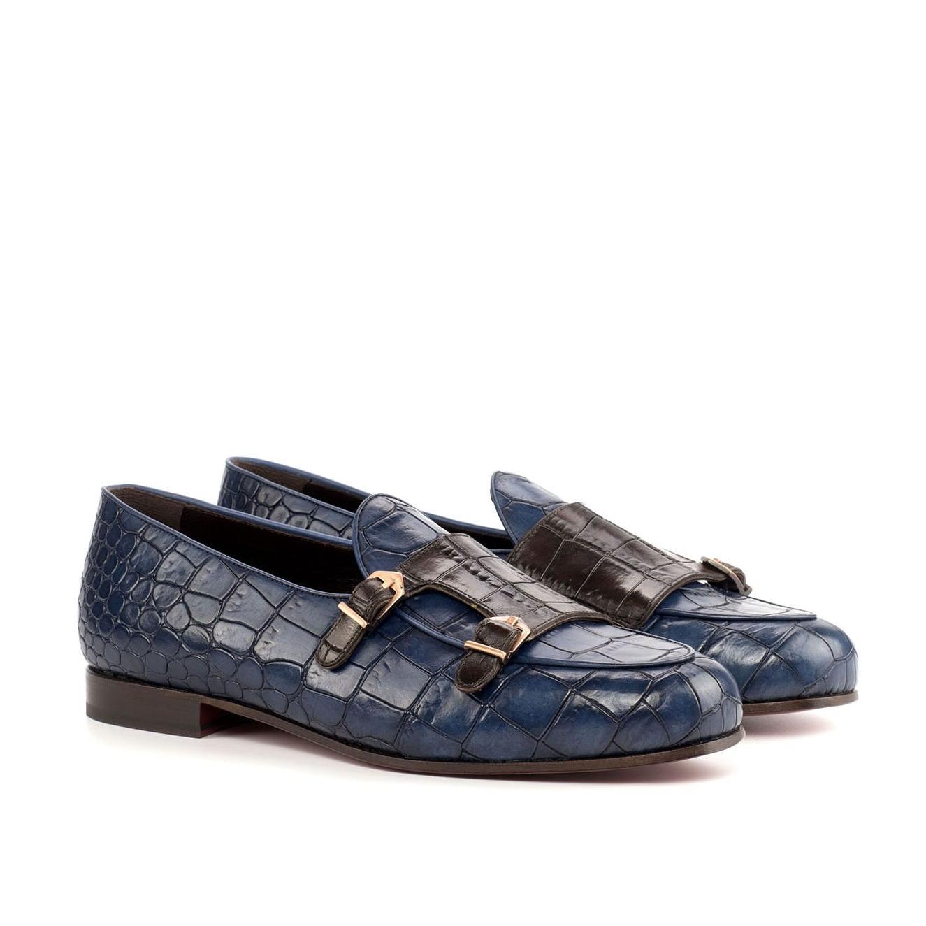 - Ambrogio 4491 Handmade Custom Men's Shoes Brown & Navy Crocodile Print / Calf-Skin Leather Monk-Strap Slip-On Loafers (AMB1696)