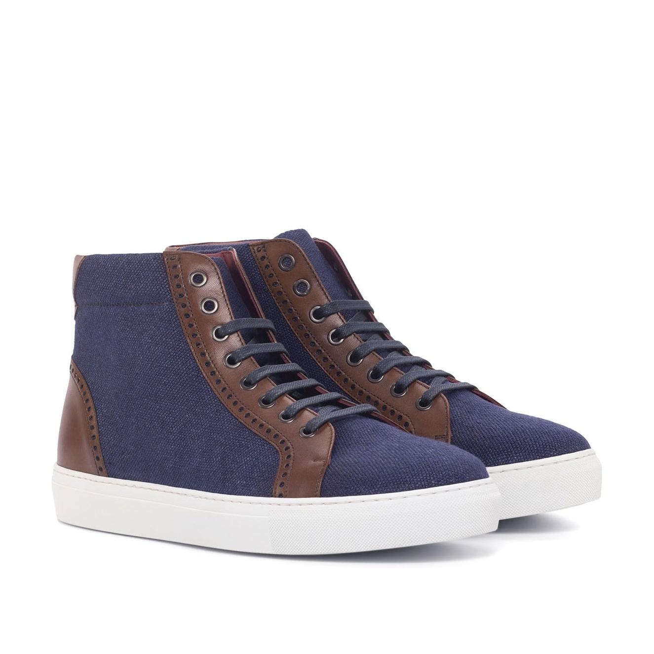 • Ambrogio 4584 Handmade Custom Men's Shoes Navy & Brown Linen Fabric / Calf-Skin Leather High-Top Sneakers (AMB1835)