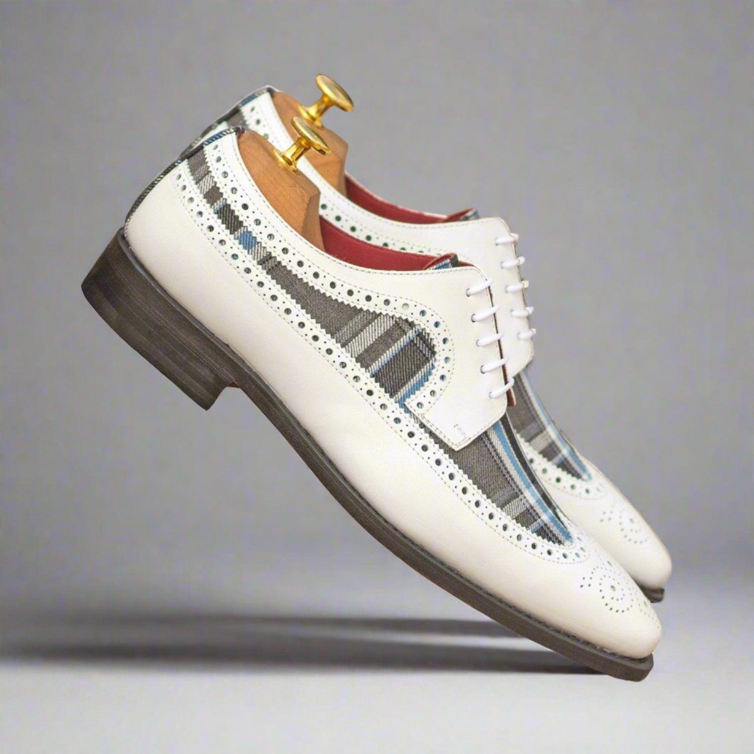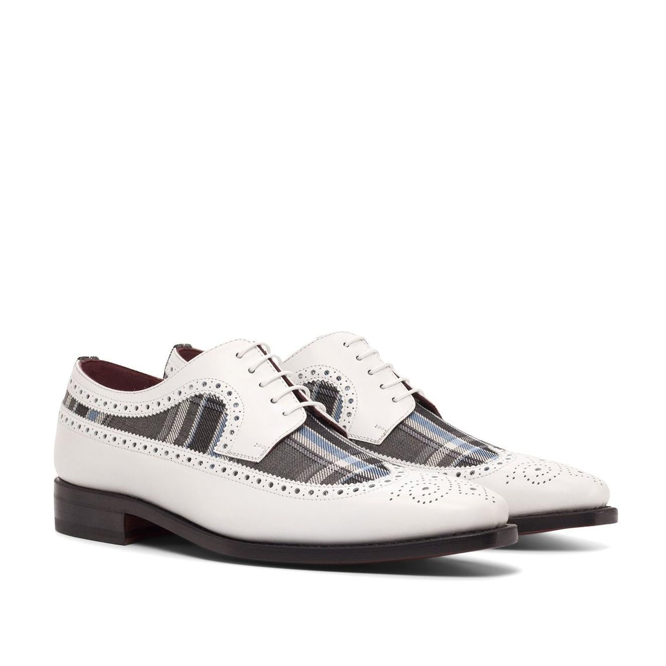 - Ambrogio Handmade Custom Men's Shoes White, Gray & Blue Plaid Fabric / Box Calf-Skin Leather Longwing Blucher Oxfords (AMB2199)