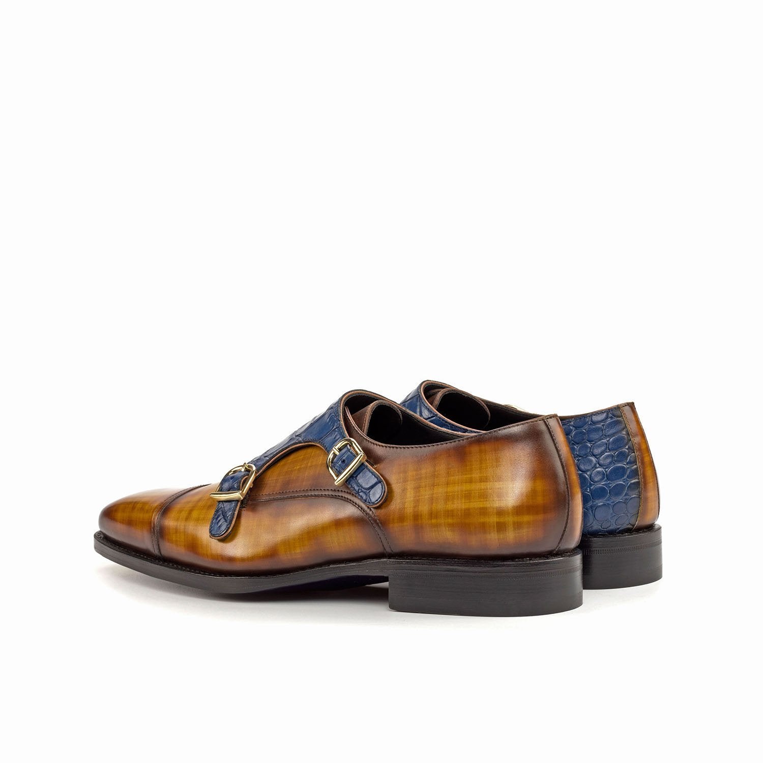 - Ambrogio Handmade Custom Men's Shoes Cognac & Navy Crocodile Print / Patina Leather Monk-Straps Loafers (AMB1912)