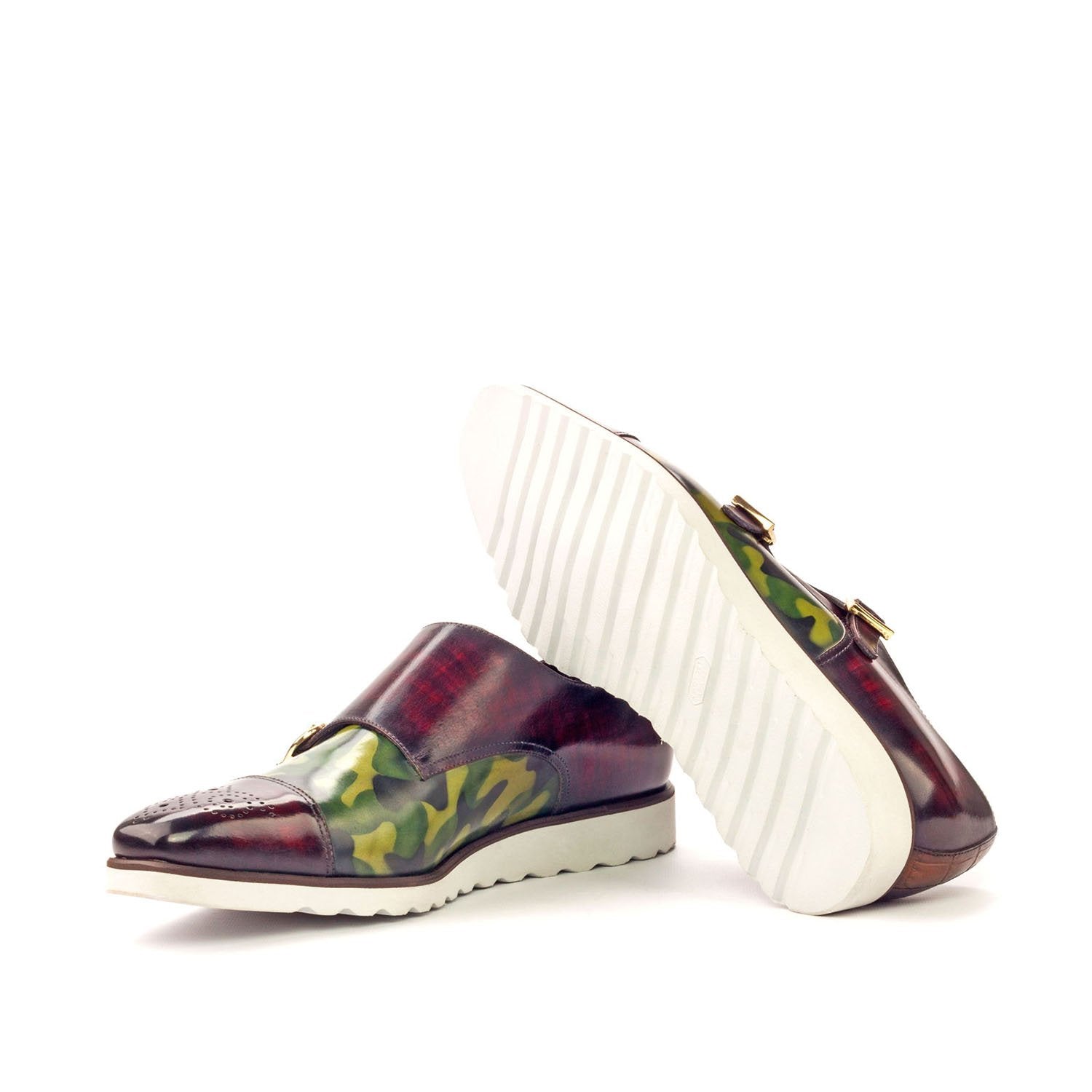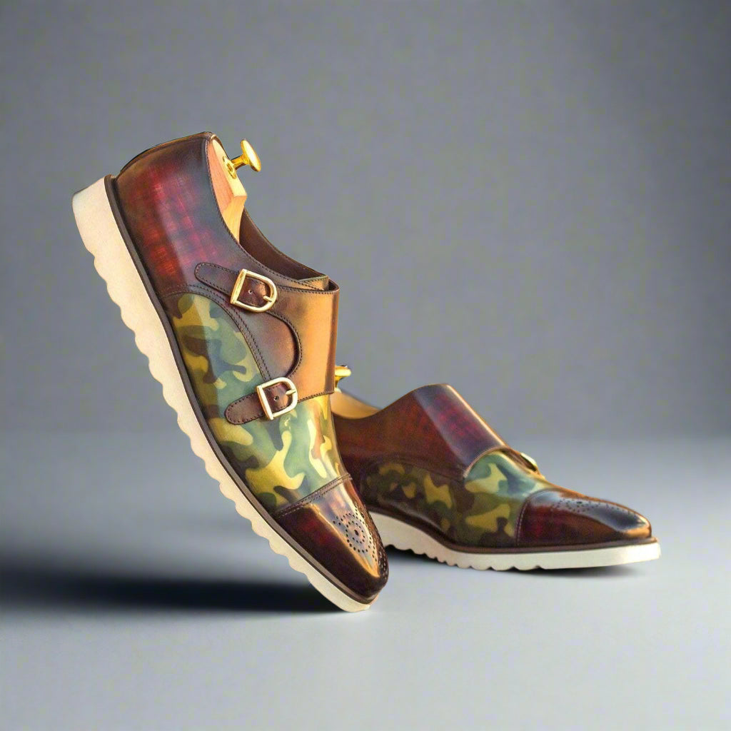 Ambrogio Handmade Men's Handmade Custom Made Shoes Brown / Burgundy / Green Patina Leather Monk-Straps Sneakers (AMB1251)