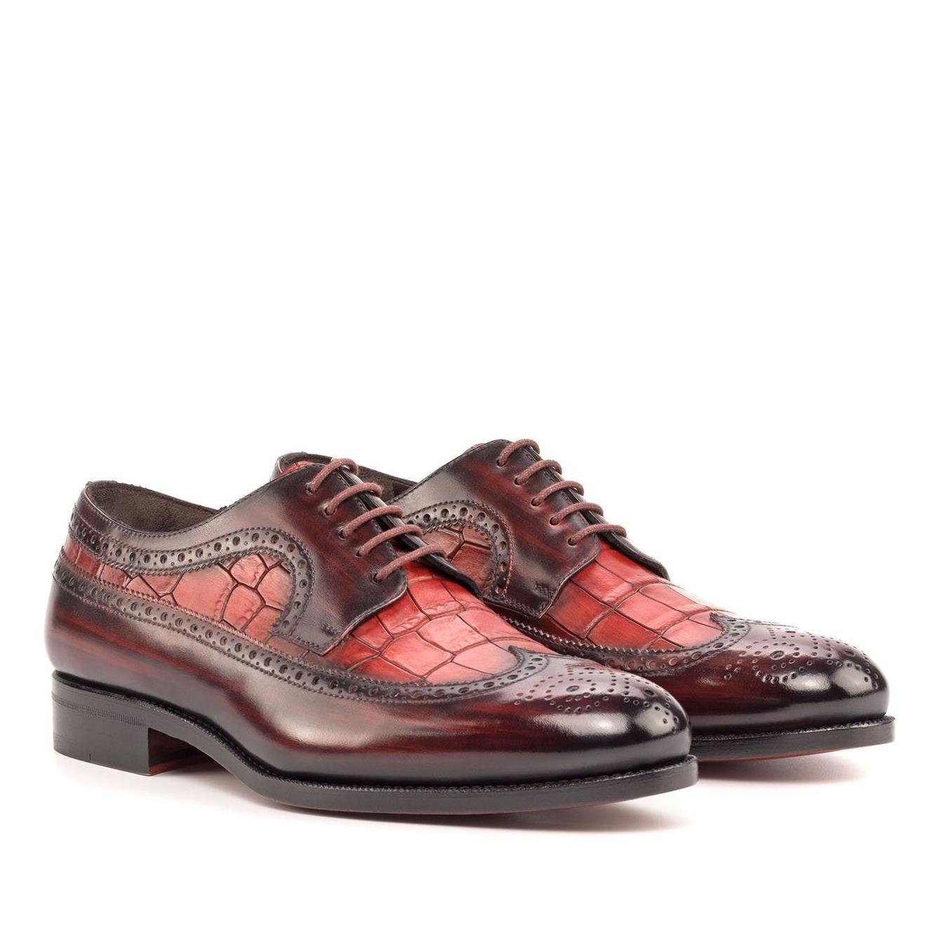 - Ambrogio Handmade Men's Shoes Burgundy & Red Crocodile Print / Patina Leather Longwing Blucher Oxfords (AMB2243)
