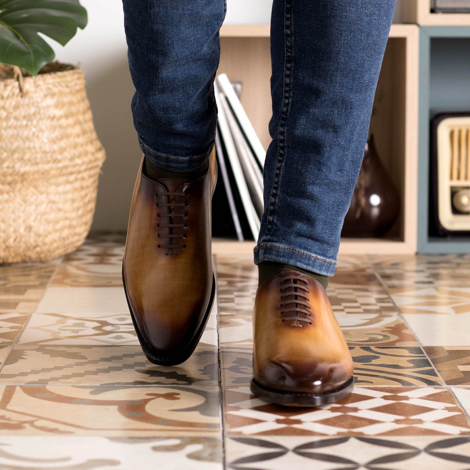 - Ambrogio Handmade Men's Shoes Cognac Patina Leather Whole-Cut Oxfords (AMB2375)