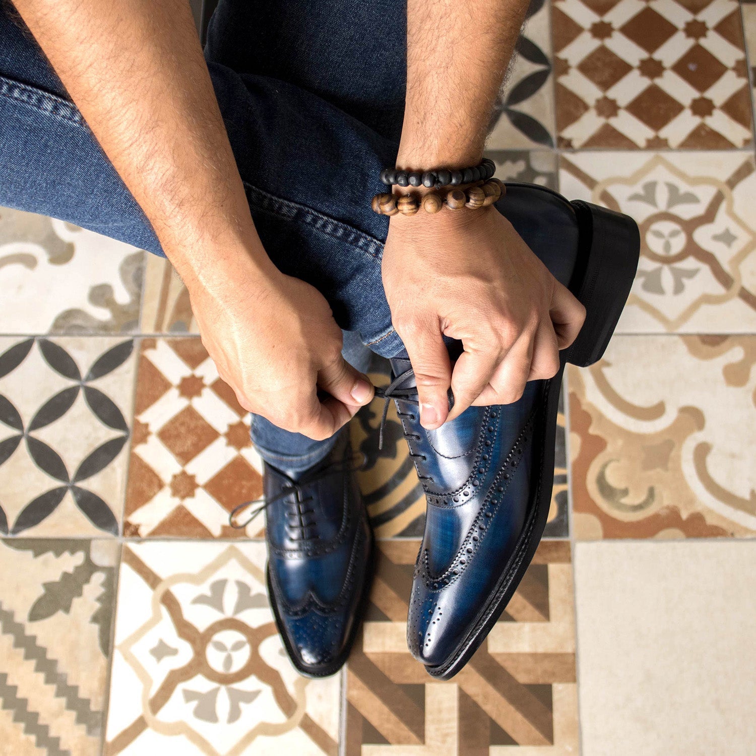 - Ambrogio Handmade Men's Shoes Denim Patina Leather Wingtip Oxfords (AMB2364)