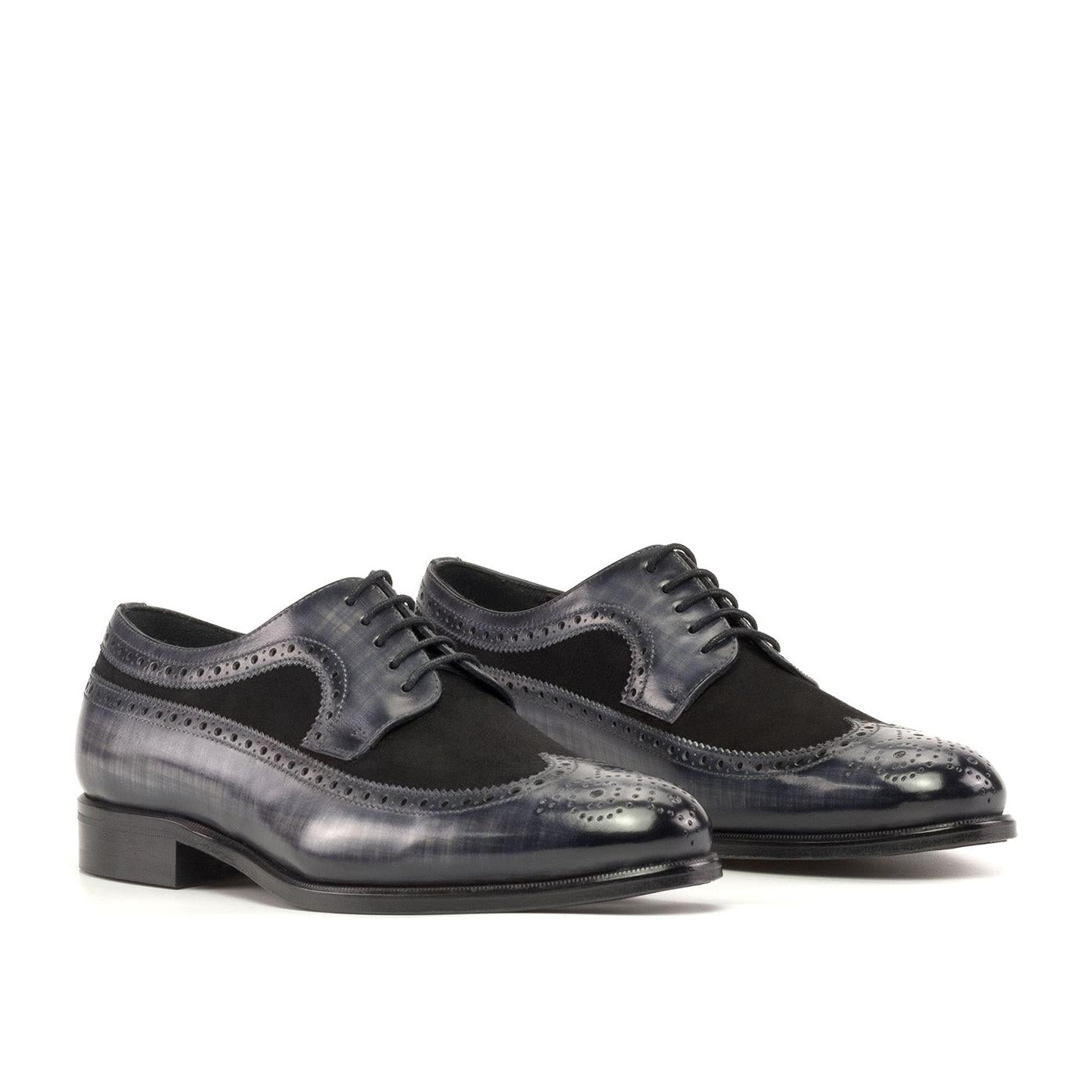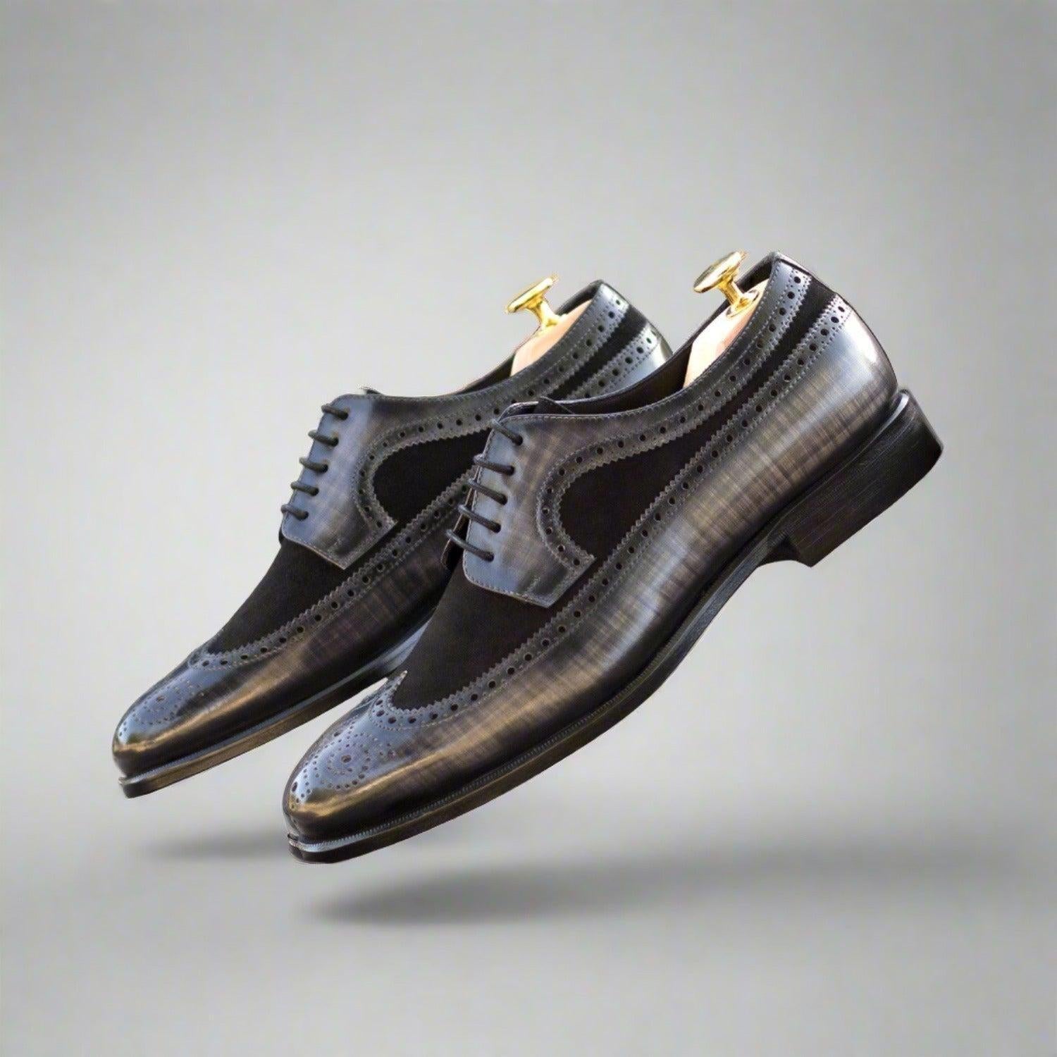 Ambrogio Handmade Black & Gray Suede / Patina Leather Longwing Blucher Oxfords (AMB2342) by Ambrogio reflects the craftsmanship and heritage behind premium European design. Created with attention to detail and high-quality materials, this Men's Shoes delivers a refined balance of elegance, comfort, and lasting quality.