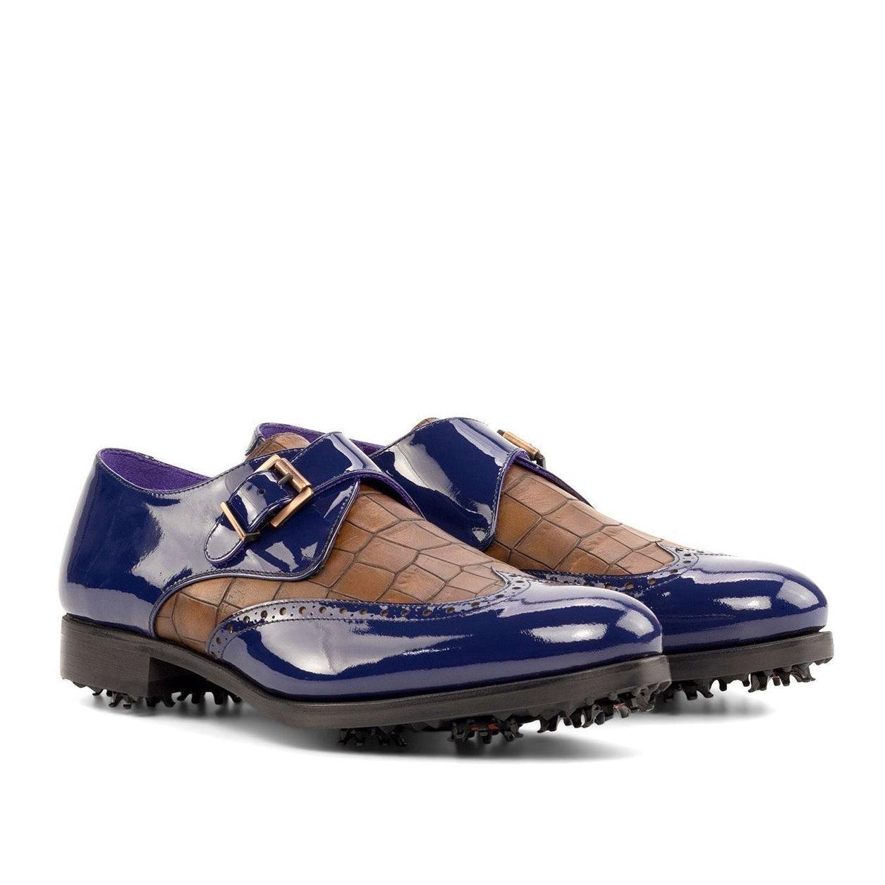 Ambrogio Handmade Cobalt Blue & Brown Crocodile Print / Patent Leather Monk-Strap Golf Loafers (AMB2267) by Ambrogio reflects the craftsmanship and heritage behind premium European design. Created with attention to detail and high-quality materials, this Men's Shoes delivers a refined balance of elegance, comfort, and lasting quality.