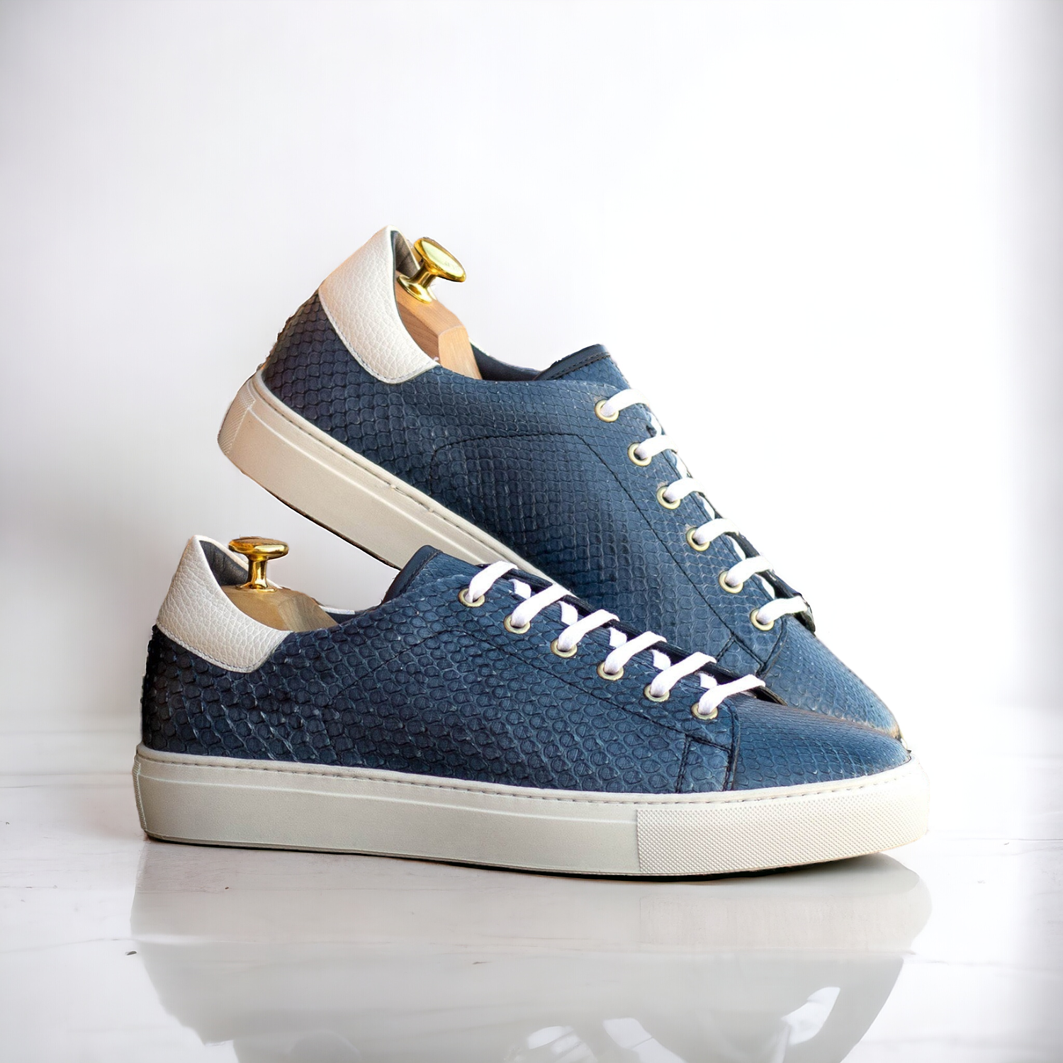 Ambrogio Handmade White & Navy Exotic Python Trainer Sneakers (AMB2483) by Ambrogio reflects the craftsmanship and heritage behind premium European design. Created with attention to detail and high-quality materials, this Men's Shoes delivers a refined balance of elegance, comfort, and lasting quality.