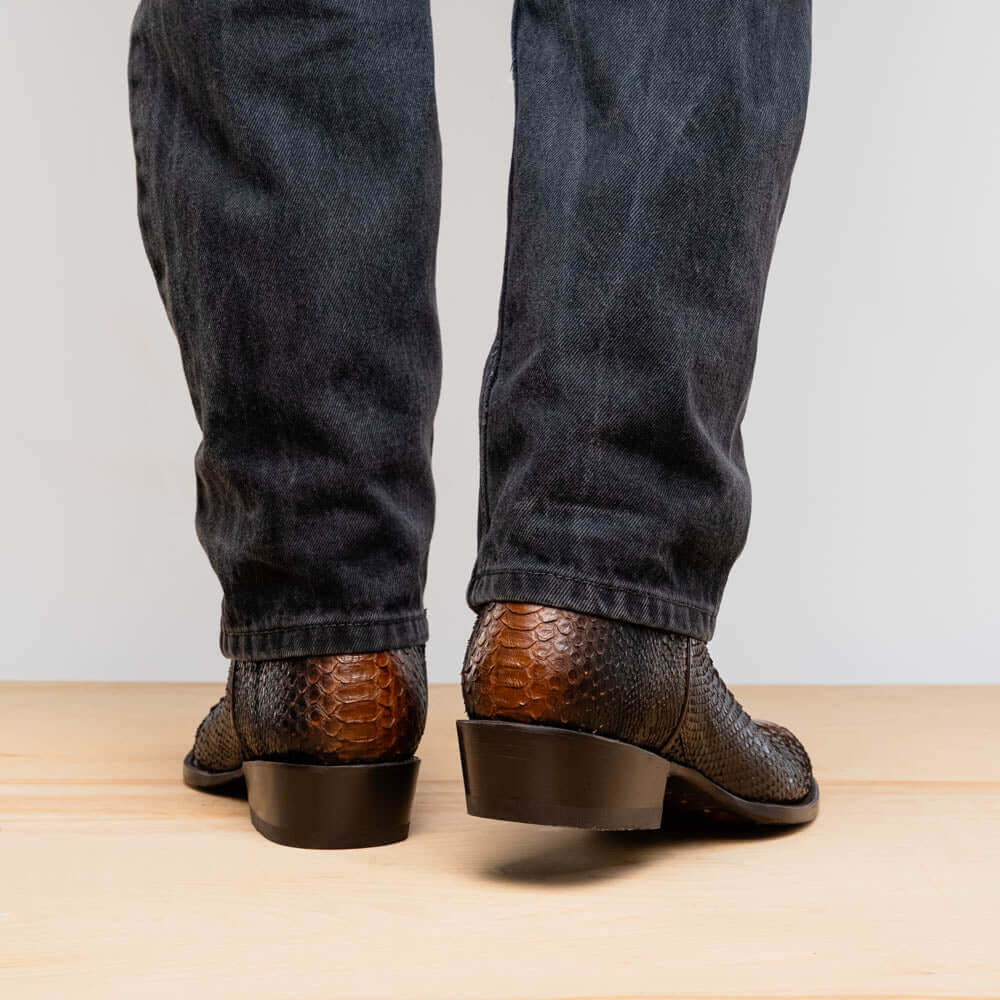 The KANSAS boot is a bold expression of authentic Western heritage elevated by luxury craftsmanship. Expertly handcrafted using genuine Python skin for the vamp and rich full-grain leather on the shaft, this piece delivers timeless cowboy attitude with a refined and modern edge. The contrast stitching and signature red interior lining add a distinctive flair—designed to turn heads whether you're on the ranch or the city streets.