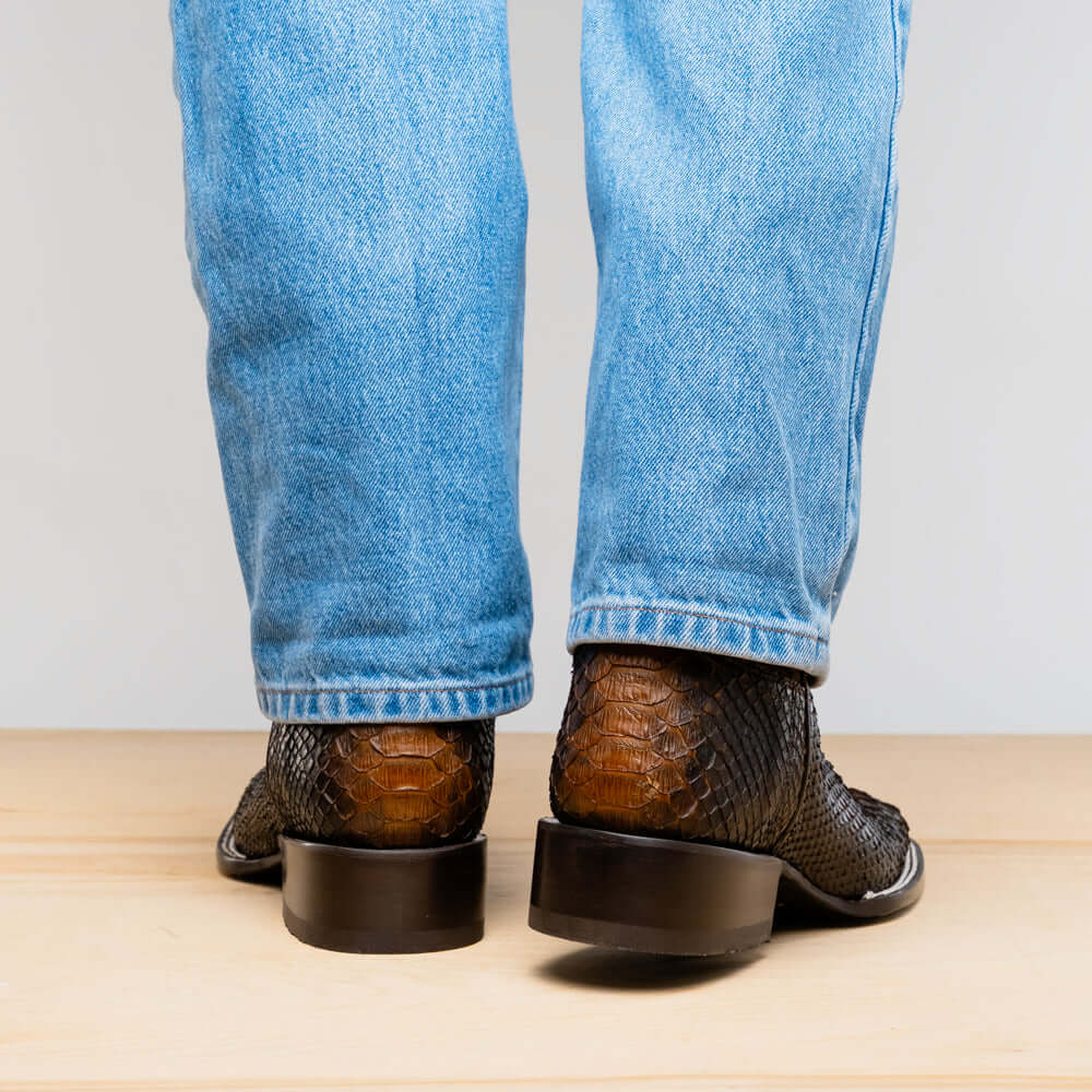 The MISSOURI boot captures the spirit of the West through bold design, master craftsmanship, and premium exotic materials. Handcrafted using genuine Python skin on the vamp and full-grain leather on the shaft, it delivers rich texture and visual contrast. The defining square toe adds a confident, modern twist to the classic cowboy profile, while the signature red leather lining brings a refined interior finish.