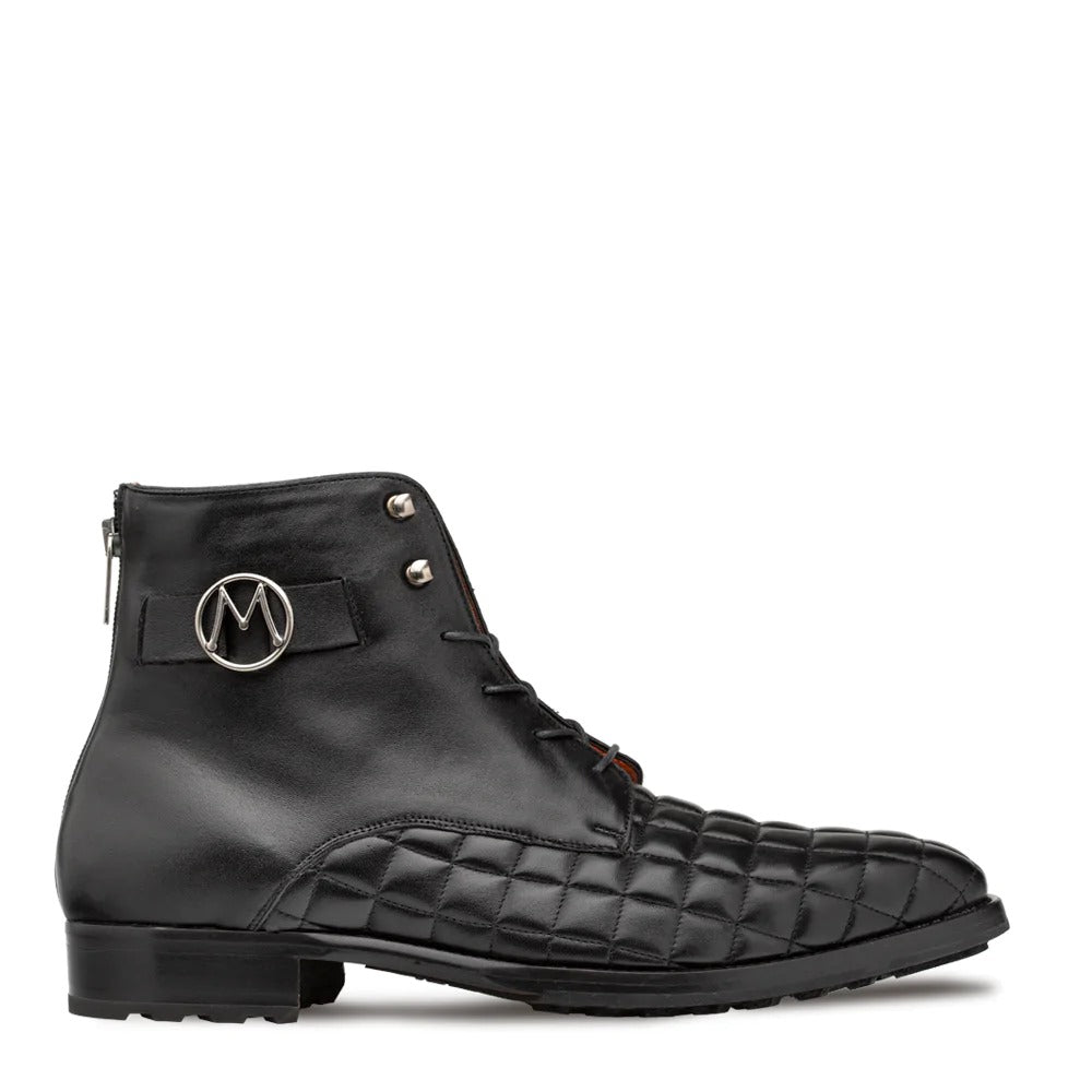 Mezlan's power-fashion lace up boot of the season! From its stitched quilted foot to its rubber/leather grid sole, the metallic details adorn this masculine boot in all its glory. Rev it up!