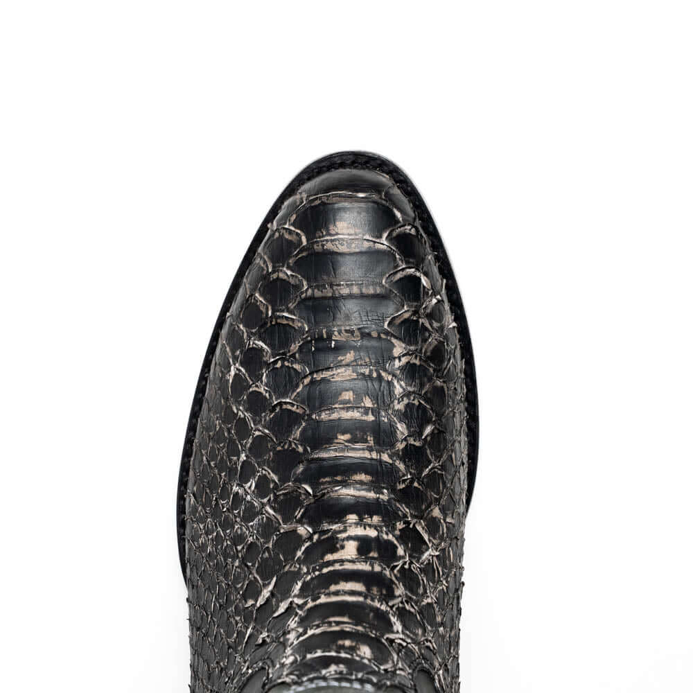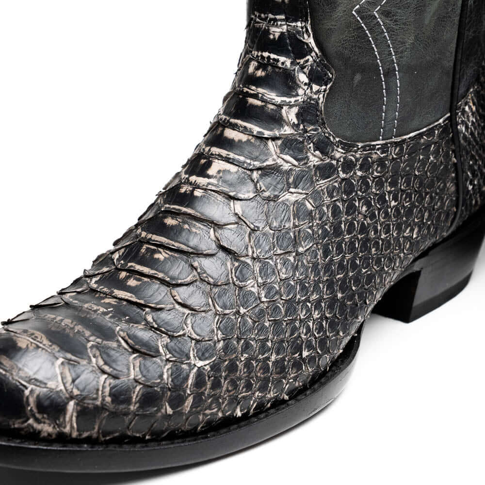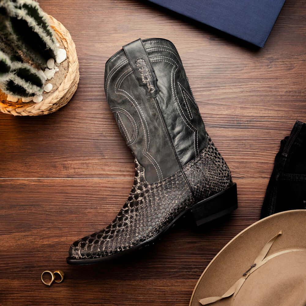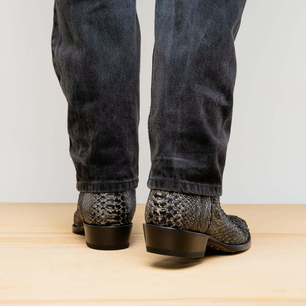 The KANSAS boot is a bold expression of authentic Western heritage elevated by luxury craftsmanship. Expertly handcrafted using genuine Python skin for the vamp and rich full-grain leather on the shaft, this piece delivers timeless cowboy attitude with a refined and modern edge. The contrast stitching and signature red interior lining add a distinctive flair—designed to turn heads whether you're on the ranch or the city streets.