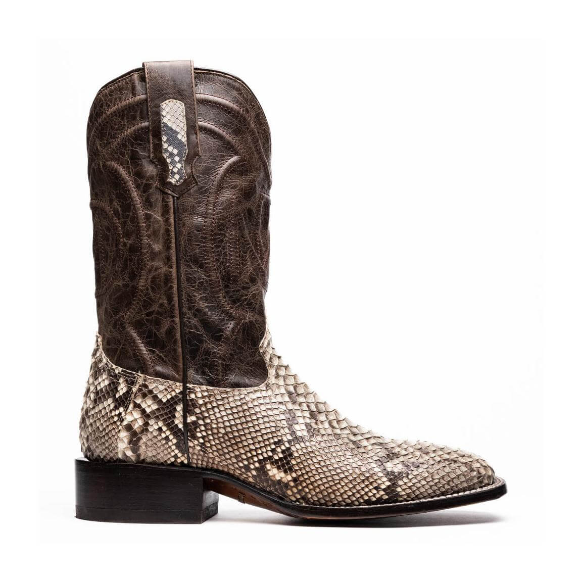 The MISSOURI boot captures the spirit of the West through bold design, master craftsmanship, and premium exotic materials. Handcrafted using genuine Python skin on the vamp and full-grain leather on the shaft, it delivers rich texture and visual contrast. The defining square toe adds a confident, modern twist to the classic cowboy profile, while the signature red leather lining brings a refined interior finish. Whether you're headed out on the town or elevating your everyday wardrobe, the MISSOURI boot offers standout style and comfort for the man who walks his own path.