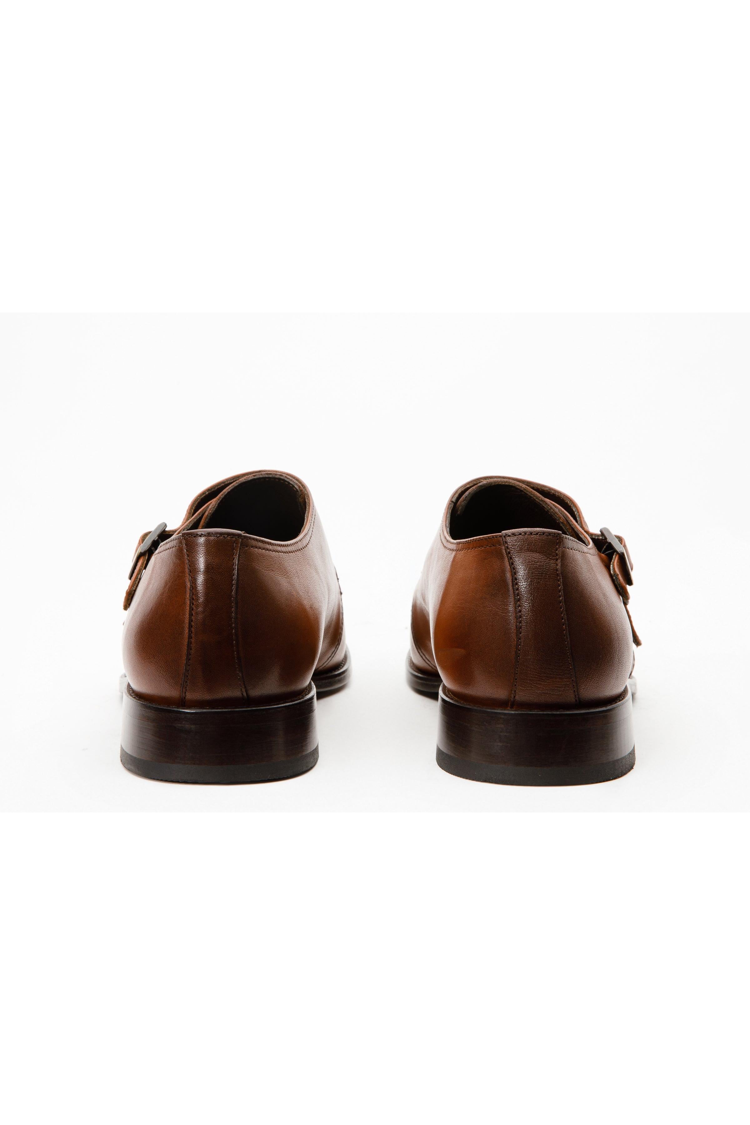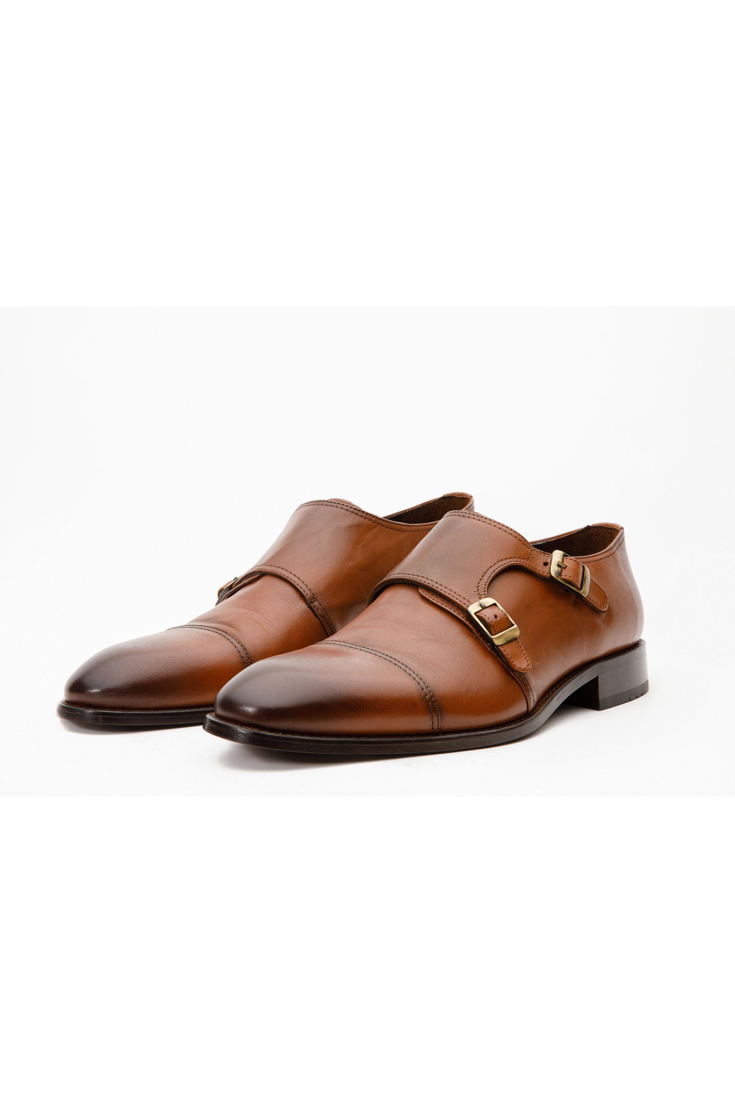 The hand-painted brown leather upper shines subtly, paired with a sleek double monk-strap featuring polished silver buckles for a sharp, sophisticated touch. A rounded toe and durable leather outsole complete the look with timeless style and resilience.
