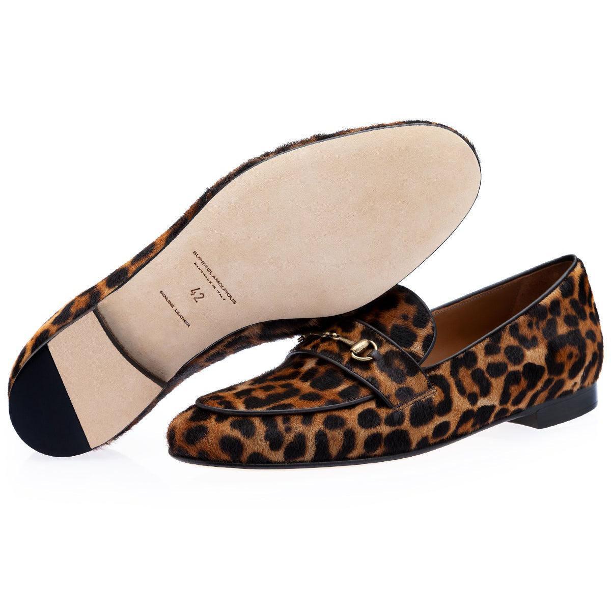 - SUPERGLAMOUROUS Morris Men's Shoes Orange & Black Leopard Print / Pony Horsebit Loafers (SPGM1005)