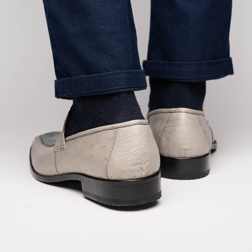 Introducing the FANGIO, our classic penny loafer with an exotic twist. Crafted with genuine ostrich leg and ostrich quill, these loafers feature a unique hand finish for a distinctive appearance. The easy slip-on application and full leather outsole make them a versatile choice for dressing up with your favorite jeans, slacks, or shorts, creating a sophisticated look with an exotic touch.