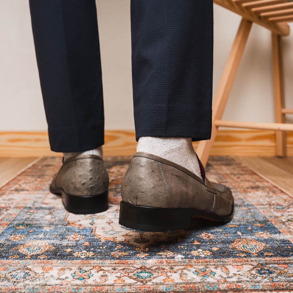 Introducing the FANGIO, our classic penny loafer with an exotic twist. Crafted with genuine ostrich leg and ostrich quill, these loafers feature a unique hand finish for a distinctive appearance. The easy slip-on application and full leather outsole make them a versatile choice for dressing up with your favorite jeans, slacks, or shorts, creating a sophisticated look with an exotic touch.