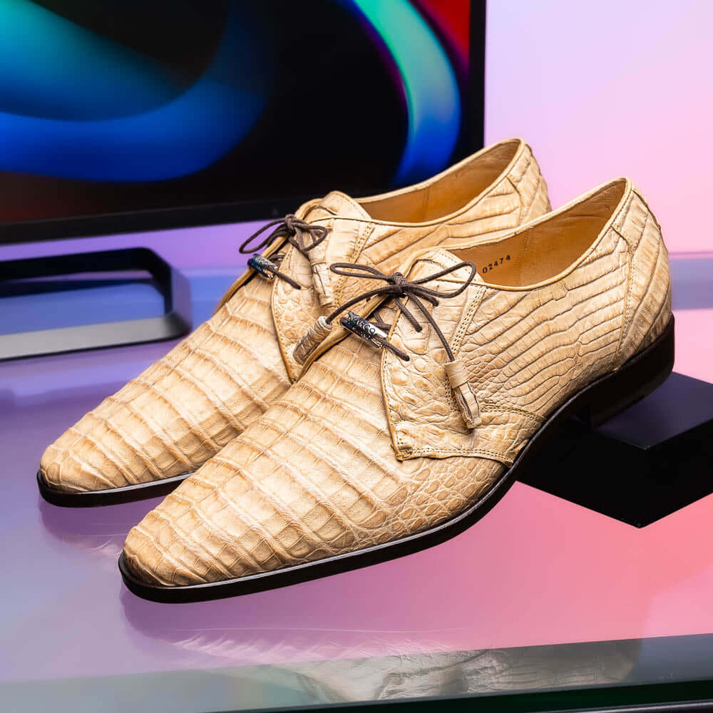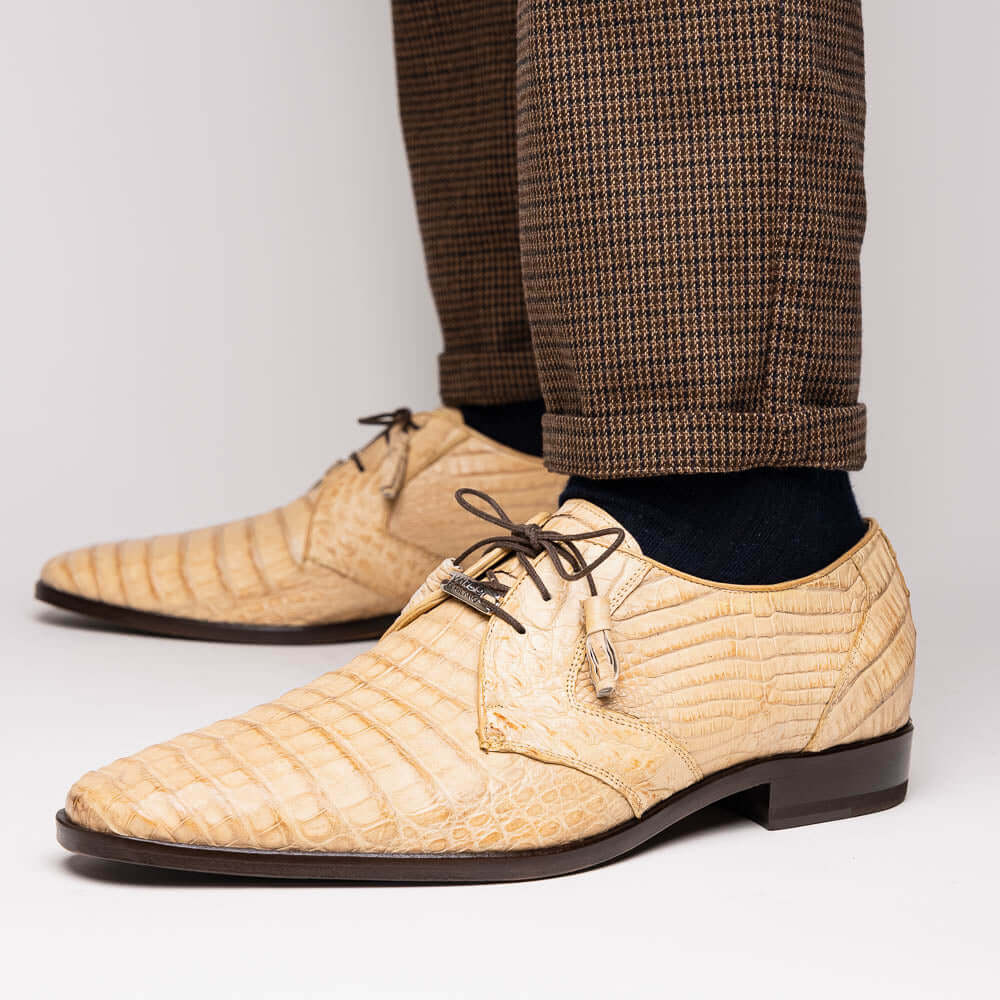 The LACIO is our fully wrapped genuine caiman crocodile dress derby's featuring tasseled laces and a polished hand finish that makes the crocodile texture pop. Dress these up with your favorite jeans or slacks for a stunning look.