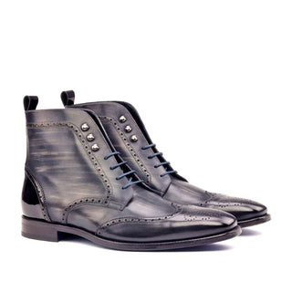 Ambrogio Men's Handmade Custom Made Shoes Black & Gray Patent / Patina Leather Military Brogue Boots (AMB1094)