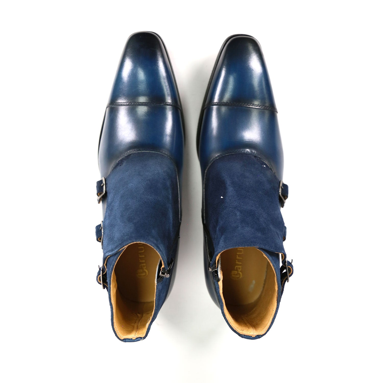 Carrucci KB503-18SC Calf/Suede Three-Buckle Monk Chukka Boot pairs a refined calfskin cap-toe vamp with a suede shaft for a modern, elevated look. Finished in a rich patina, it features three signature buckles and an inside zipper for effortless on-and-off wear. An extra-cushioned footbed delivers all-day comfort.