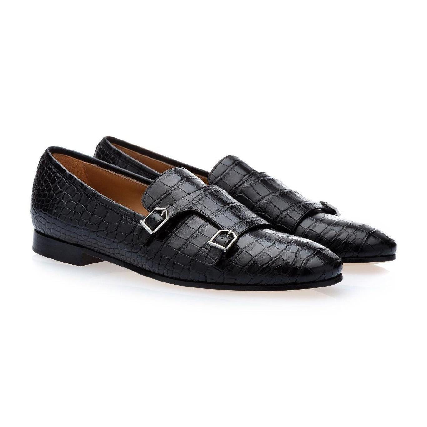 - SUPERGLAMOUROUS Odilon Mississippi Men's Shoes Black Exotic Alligator Monk-Straps Loafers (SPGM1107)