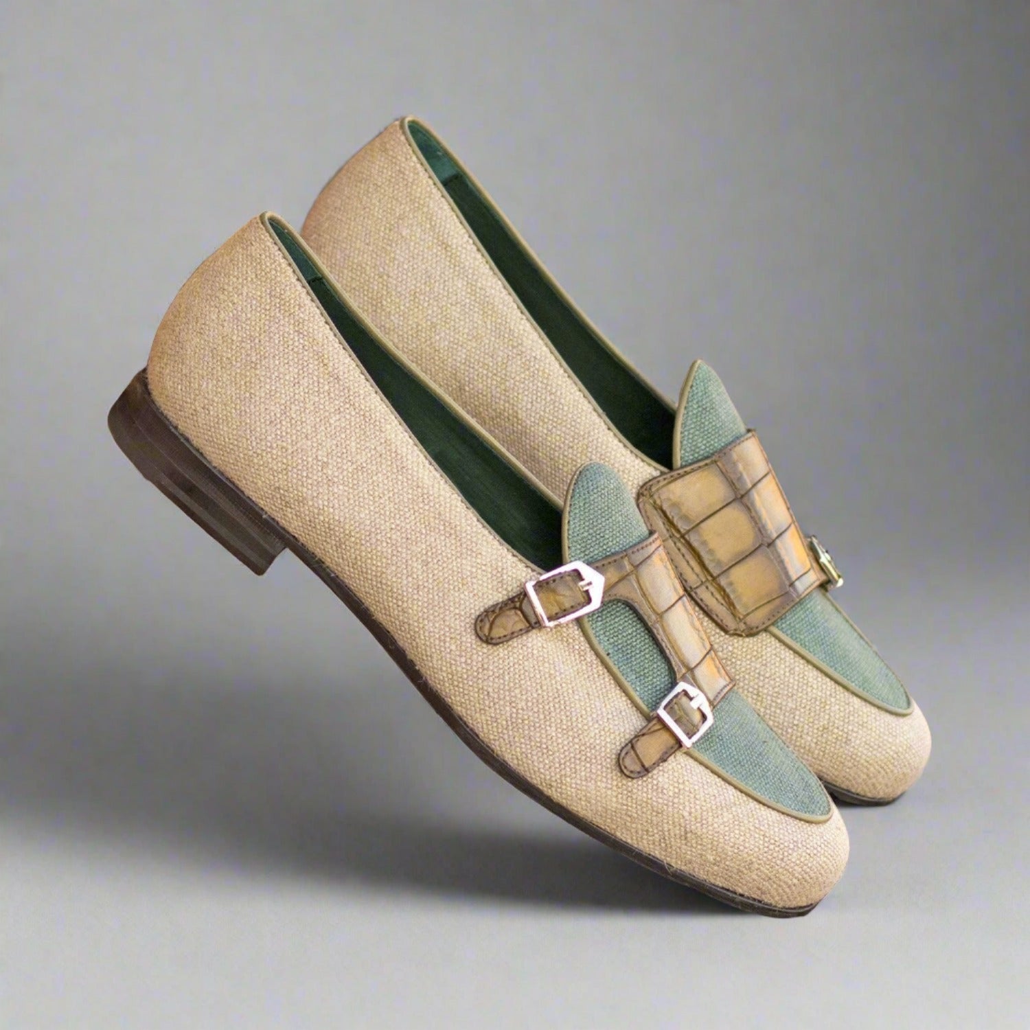Ambrogio Handmade Custom Men's Shoes Beige, Olive & Khaki Linen Fabric / Crocodile Print Leather Loafers (AMB2192)