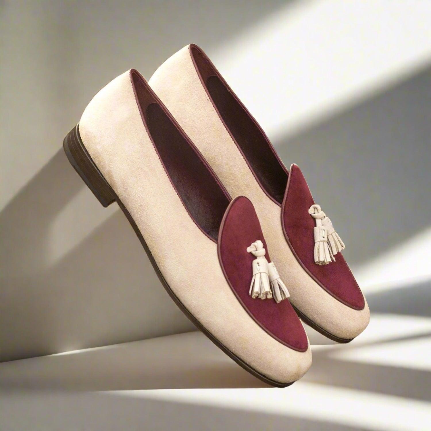 - Ambrogio Handmade Custom Men's Shoes Ivory & Burgundy Suede Leather Tassels Loafers (AMB1974)