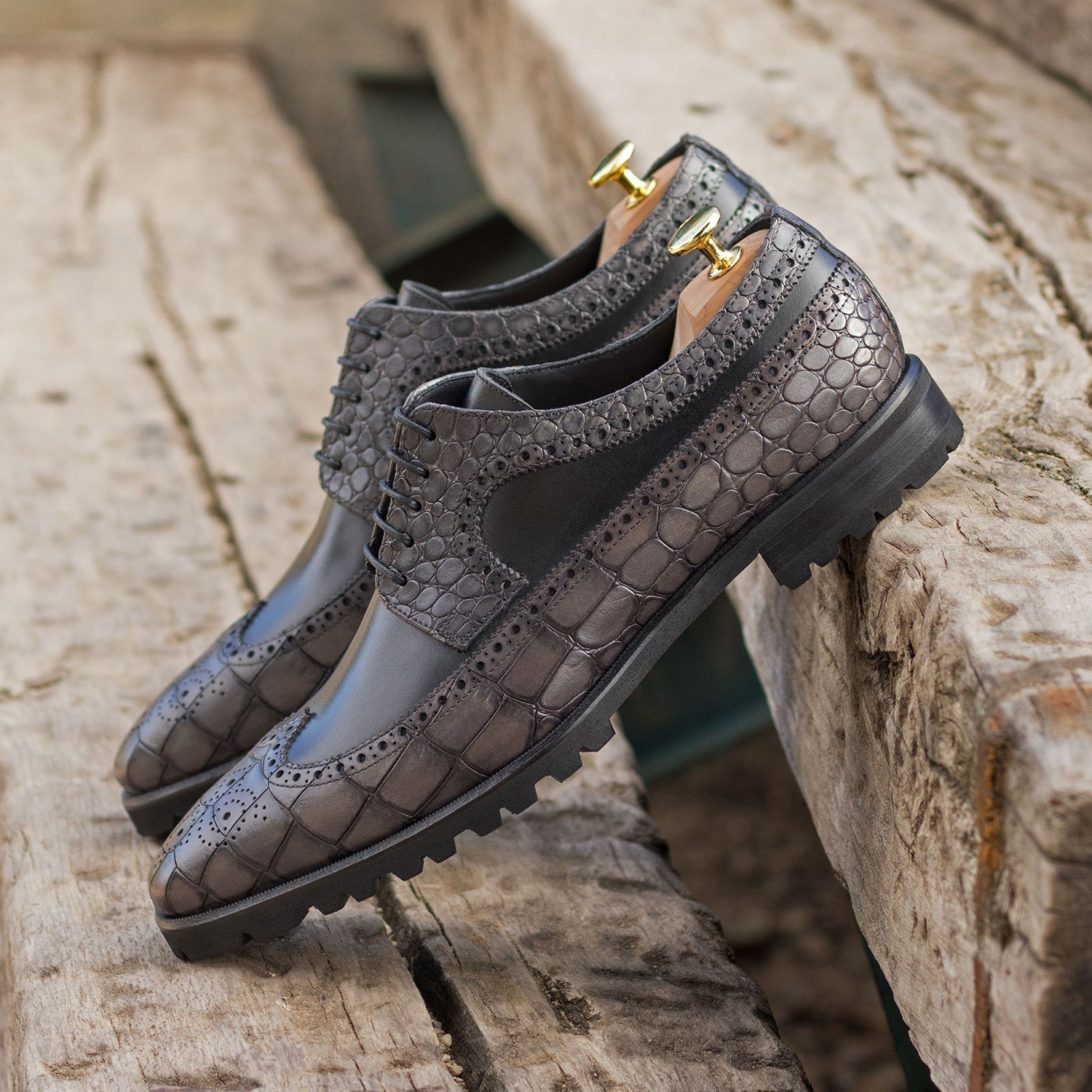 - Ambrogio Handmade Men's Shoes Black & Gray Crocodile Print / Calf-Skin Leather Wingtip Derby s(AMB2271)
