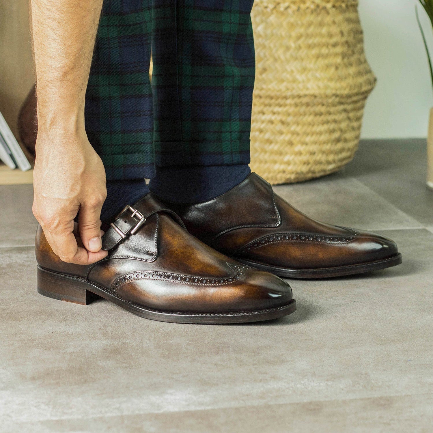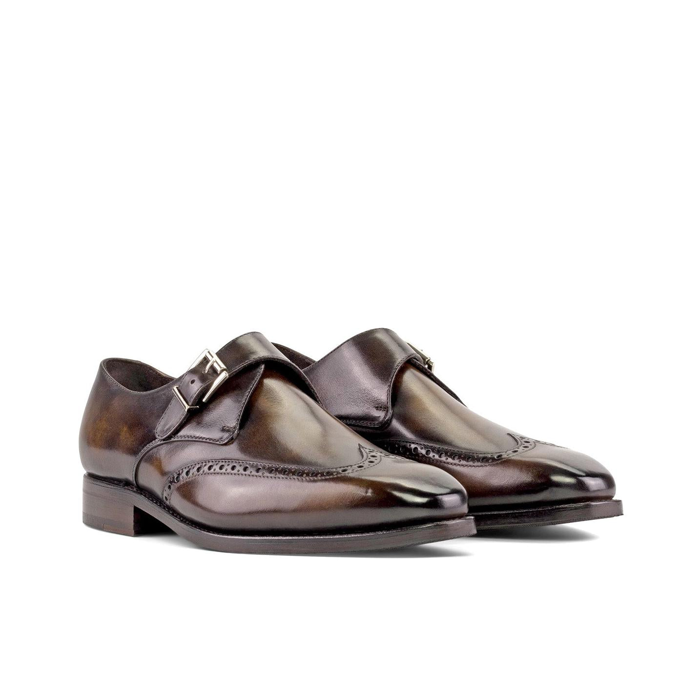 - Ambrogio Handmade Men's Shoes Tobacco Patina Leather Wingtip Monk-Straps Loafers (AMB2307)