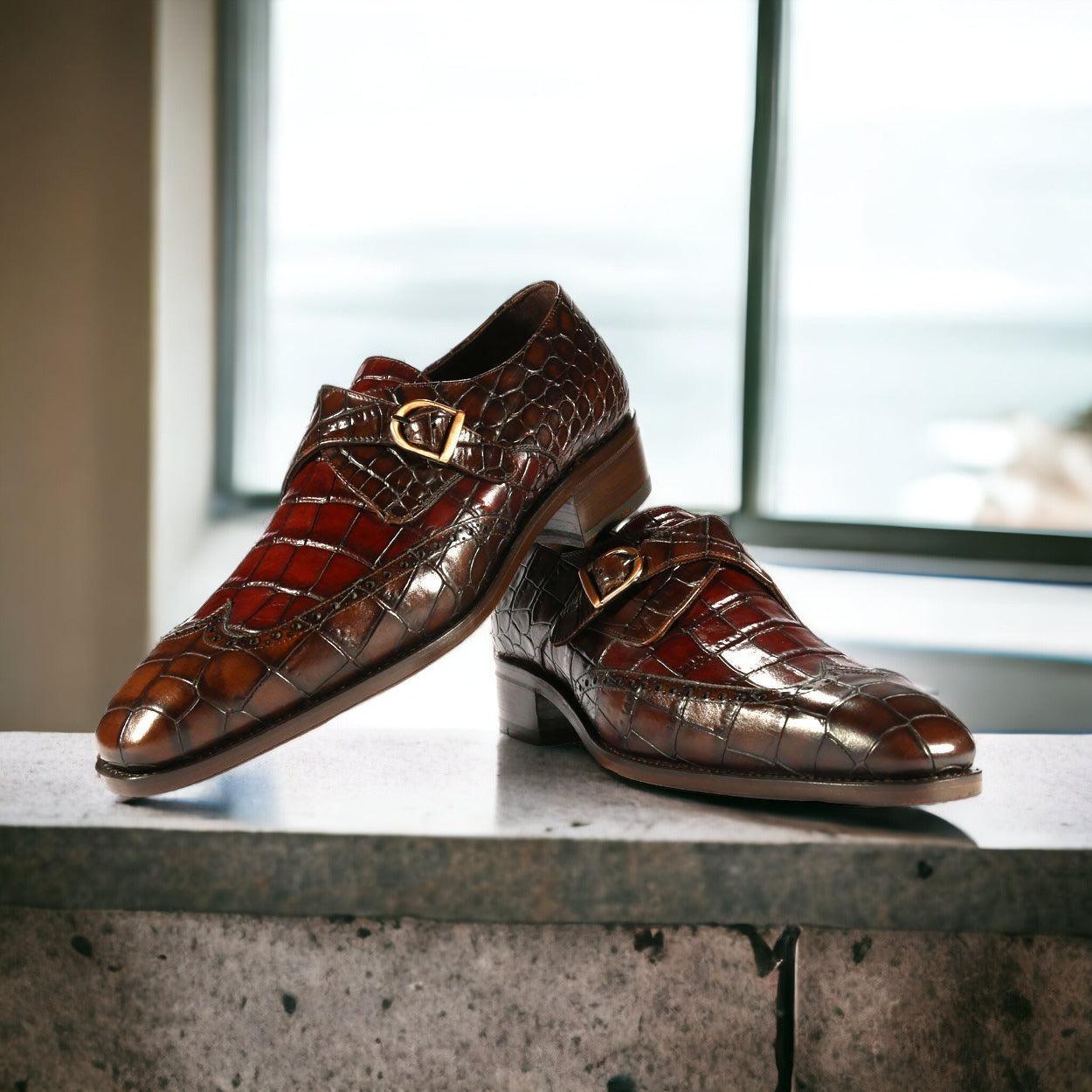 Ambrogio Men's Shoes Dark Brown & Burgundy Crocodile Print / Calf-Skin Leather Monk Strap (AMBX1001)