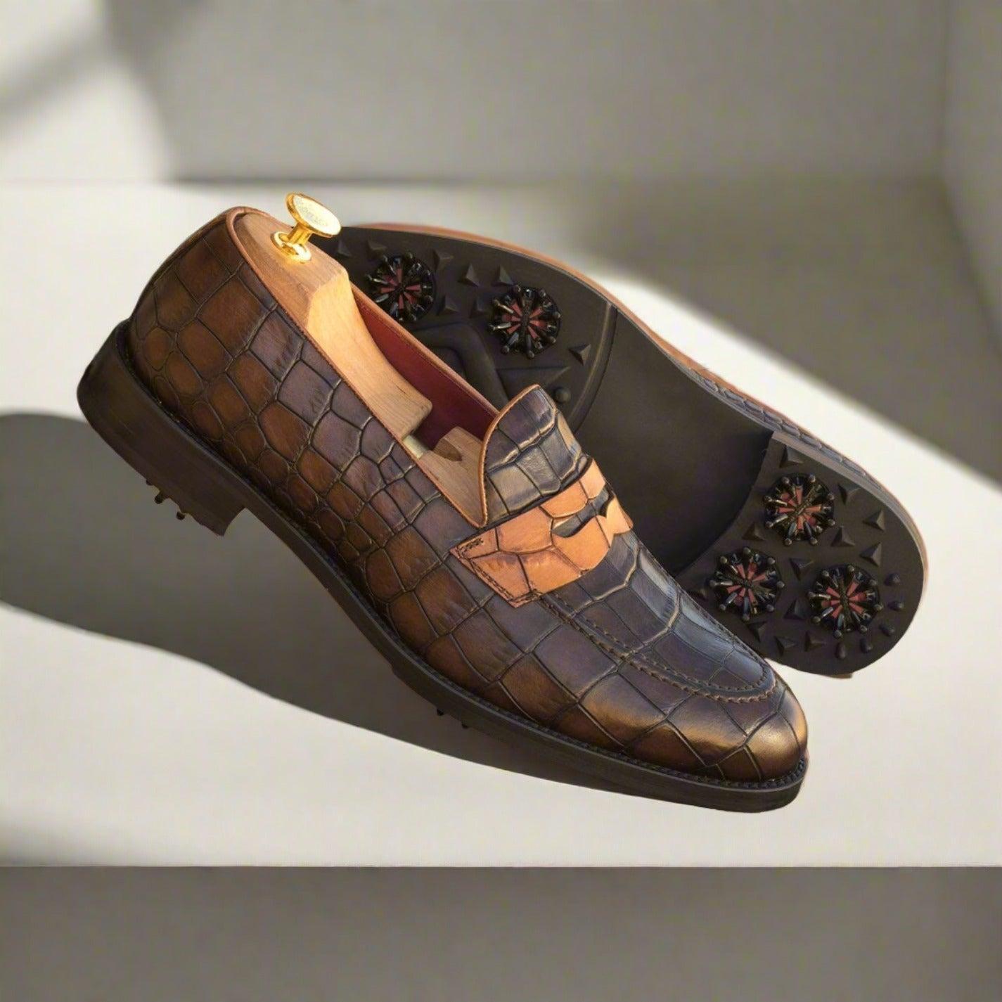 Ambrogio Men's Shoes Two-Tone Brown Crocodile Print / Calf-Skin Leather Penny Loafers (AMB2057)