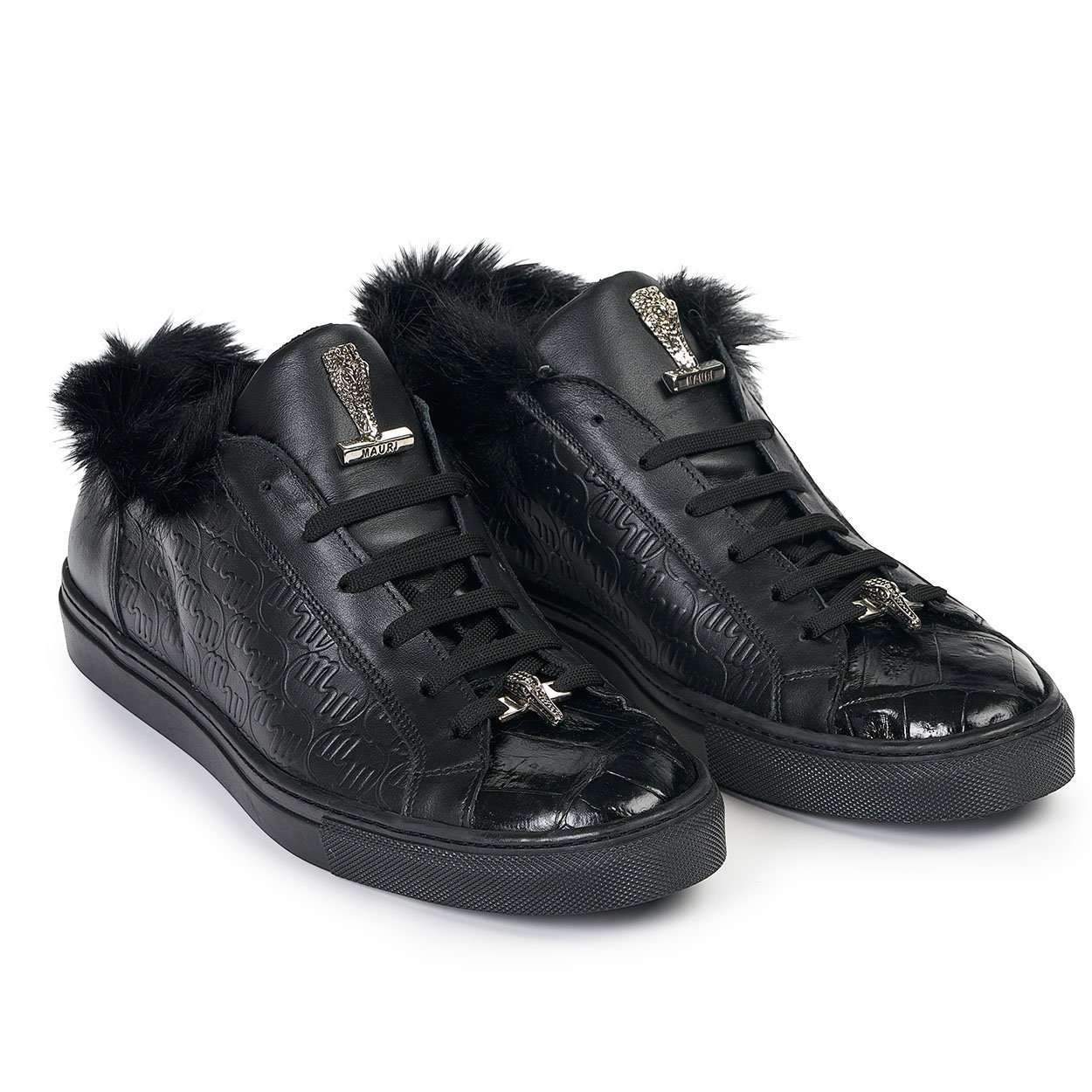 Mauri Designer Shoes Exotic Skin Men's Larice Black Kangaroo Fur & Embossed Nappa Leather Sneakers 8591(MA4817) (Special Order)