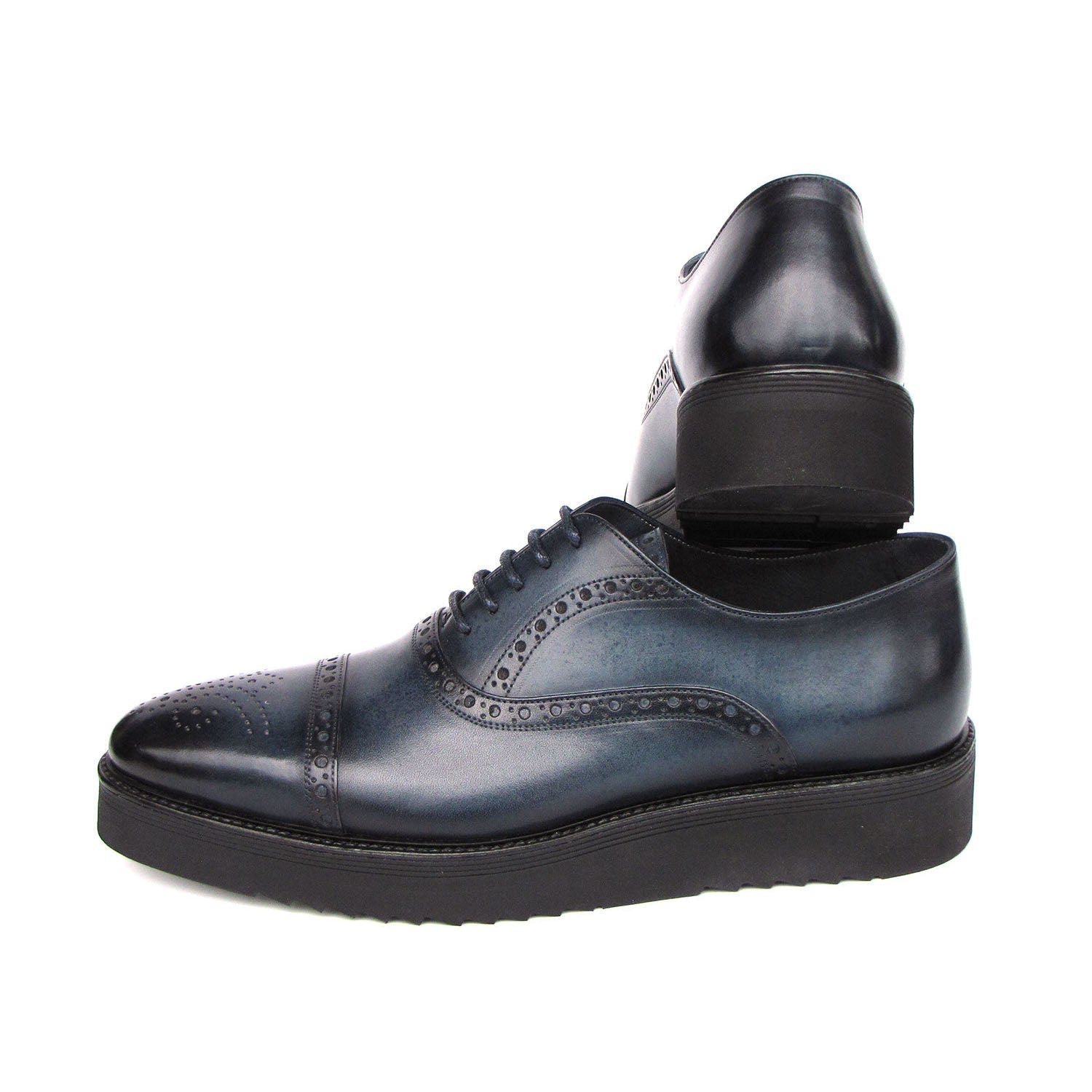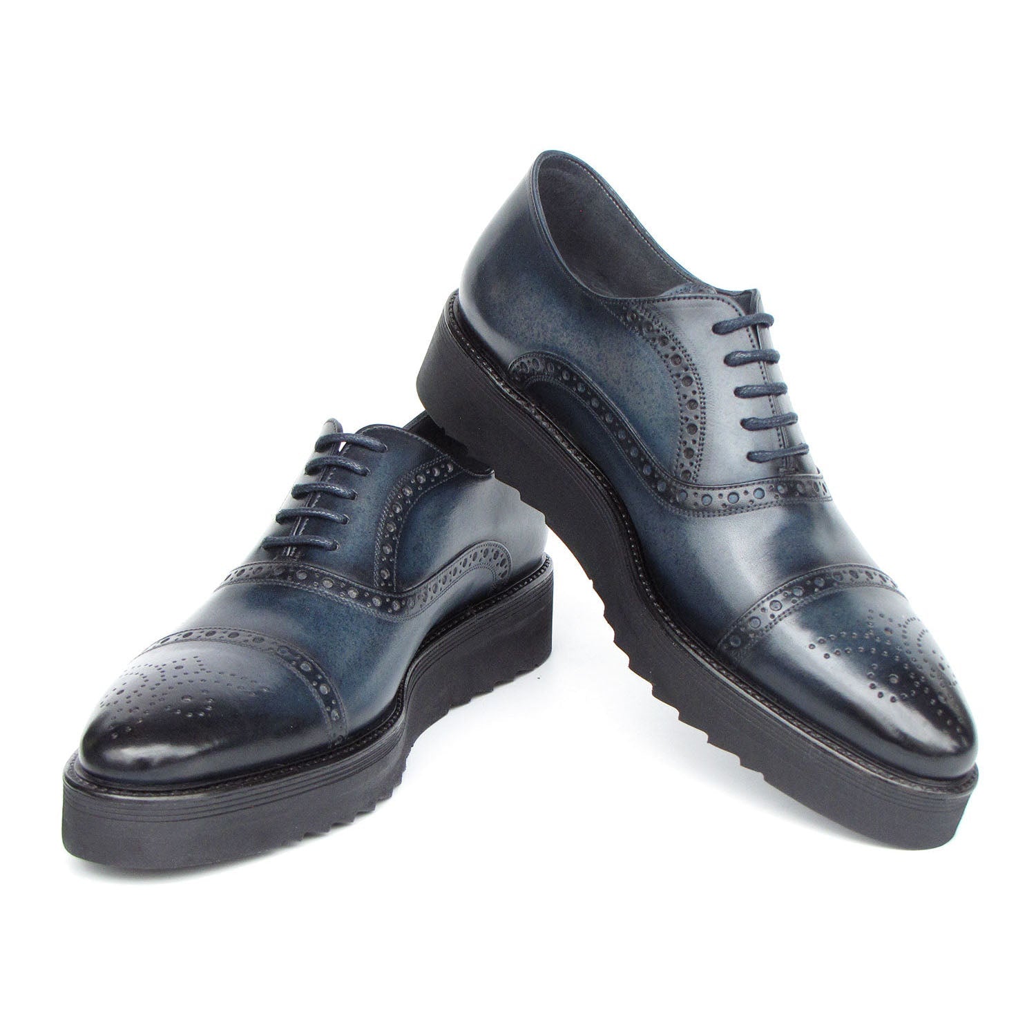 - Navy hand-painted leather upper.